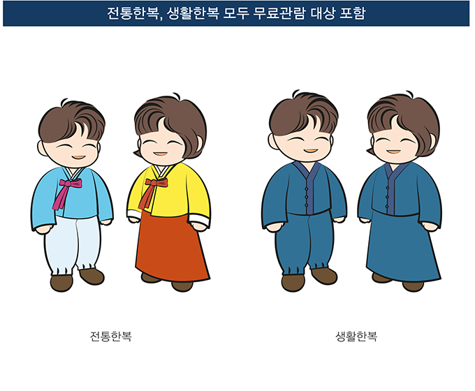 한복의 대중화 및 세계화를 목적하므로 외국인 한복 착용도 무료입장 가능합니다
